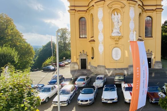 Am späteren Nachmittag trafen dann die ersten Fahrer mit ihren Wagen am Tagungshaus Schönenberg ein, das Ziel der Klassiktour 2022. Hoch über Ellwangen, zwischen historischen Mauern und mit einem atemberaubenden Ausblick auf die Landschaft, zückten viele erst einmal das Smartphone um die beeindruckende Stimmung, die die Sonne in den Himmel und auf die Landschaft zauberte, festzuhalten. Im Tagungshaus erwartete die rund 100 Teilnehmer zunächst ein Begrüßungsdrink, in Kombination mit einem kleinen Chorkonzert der „Jelly Beans" aus Rotenbach. (mehr dazu siehe S. 46) Danach lockte ein liebevoll zusammengestelltes Buffet mit allerlei Leckereien. Das Tagungshaus Schönenberg bot den passenden Rahmen für einen geselligen Abschluss der åla men Klassiktour 2022. Zudem war Gelegenheit für viele anregende Gespräche, um neue Bekannt-